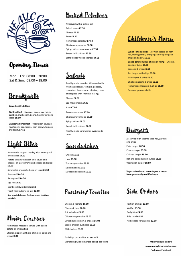Located on the ground floor of Moray Leisure Centre, the MLC Café offers a delicious selection of meals from our regular menu, alongside daily specials. Complement your meal with a choice of drinks or enjoy our freshly ground coffee, including Cappuccino, Latte, and Americano.