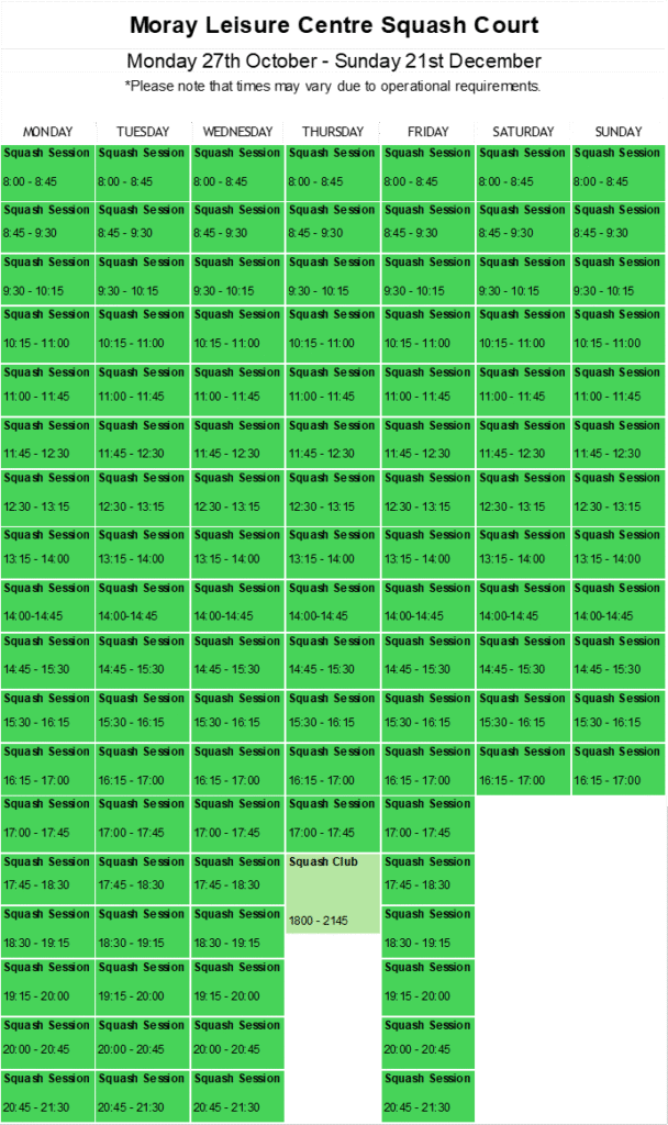 Each booking is £5.00 and you can book a Squash Session by calling reception on 01343 550033 or via our online booking system here.